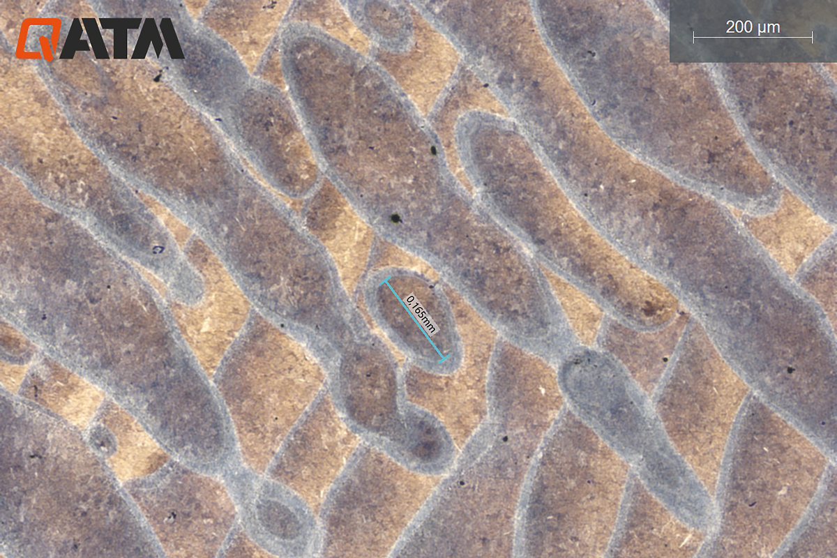 Die polierte Oberfläche in Abb. 1 weist mehrere Risse auf. Die gerade Kante auf der linken Seite wurde durch Fräsen erzielt. Die Kontur der Schweißnähte ist nicht sichtbar. Für eine detailliertere Untersuchung wurde der Kontrast durch Ätzen verstärkt. Die geätzte Oberfläche ist in Abb. 2 dargestellt. Sie weist mehr Risse auf, und die farbigen Flecken zeigen überätzte Bereiche in der Nähe mehrerer Risse aufgrund von Ätzmittelrückständen. Die Schweißnähte, die unterschiedliche Abmessungen aufweisen, sind gut sichtbar. Das schichtweise Aufbringen bewirkt eine Wärmebehandlung der darunterliegenden Schicht. Es entsteht eine Wärmeeinflusszone (HAZ), die eine Veränderung der Mikrostruktur bewirkt und die Eigenschaften der Probe beeinflusst. Beispielsweise kann die Härte verringert werden, was zu mechanischer Beanspruchung führt. Da Schichten unterschiedlicher Härte übereinander abgeschieden werden, nimmt die mechanische Beanspruchung kontinuierlich zu und kann zu sogenannten Sekundärrissen führen.
