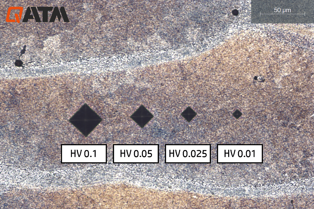 Die so gefertigten Bauteile weisen eine Härte von 115 bis 130 HV auf, was in weiterer Folge Prüfkräfte >100 g bedingt. Für das Aluminiumpulver in unserem Beispiel ist eine Härte von 125 bis 130 HV zu erwarten, so dass Ergebnisse mit Prüfkräften >100g (HV0.1) bereits der Vickers DIN EN ISO und ASTM- Norm entsprechen können (Standardanforderung: Vickers Eindrucksdiagonale >20 μm). Wenn am Härteprüfgerät geringere Prüfkräfte eingesetzt werden, ist auch eine Prüfung von feineren Partikeln möglich, dann jedoch nicht normkonform.