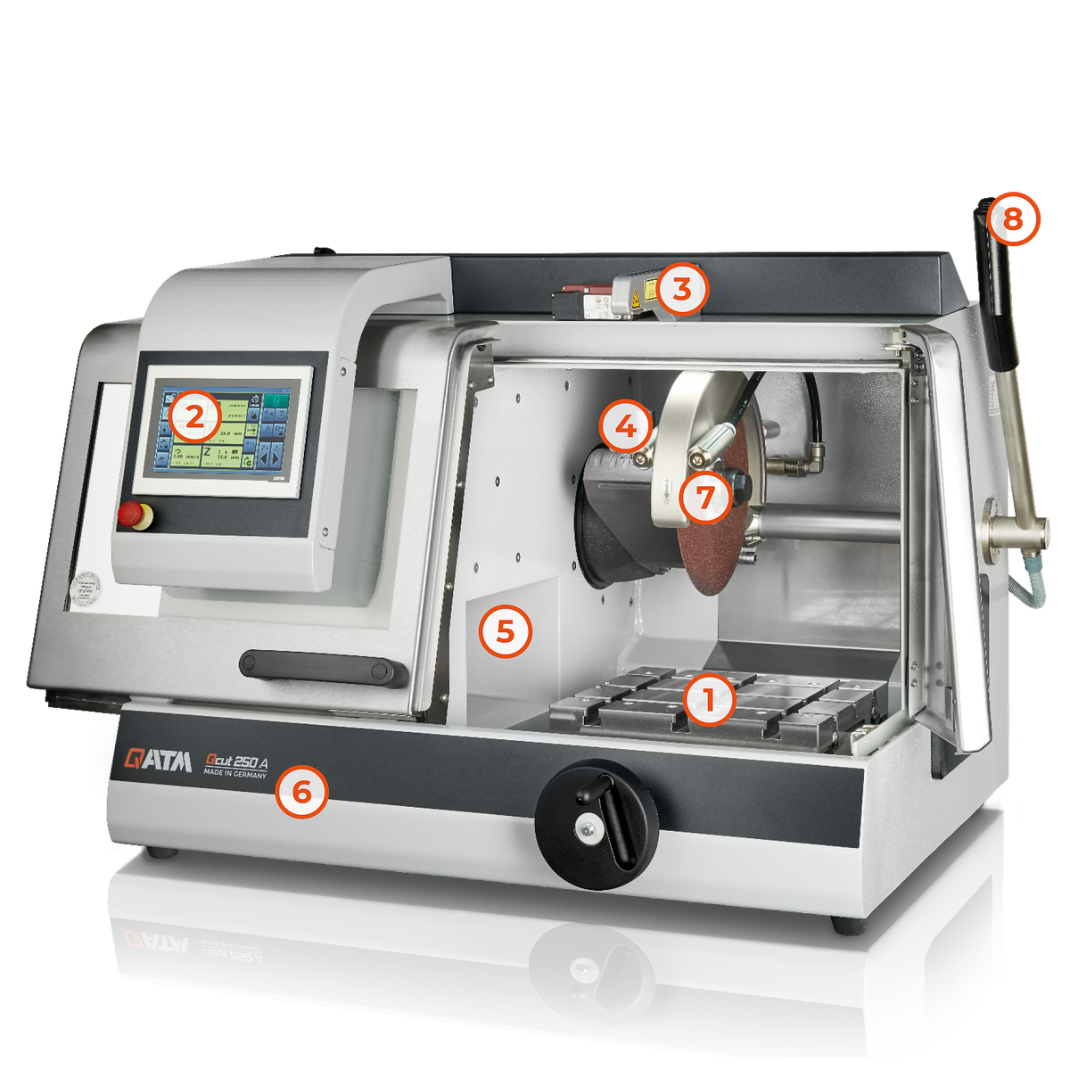 La Qcut 250 A semiautomática, equipada con una palanca manual y un freno de palanca automático, se puede manejar con una sola mano y facilita más que nunca los cortes verticales o el posicionamiento del disco de corte. La mesa de corte con ranuras en T está fabricada en acero inoxidable y se puede utilizar tanto con un accionamiento automático dinámico (admite el corte por pulsos) como en modo manual, manejándose con un volante (corte transversal). Junto con la tecnología de corte por pulsos perfectamente constatada de QATM, la Qcut 250 A ofrece unos excelentes resultados de corte incluso en los materiales más difíciles. Además, el eje X automático permite realizar el corte Care-Cut (corte oscilante) durante un corte por golpe en piezas grandes.