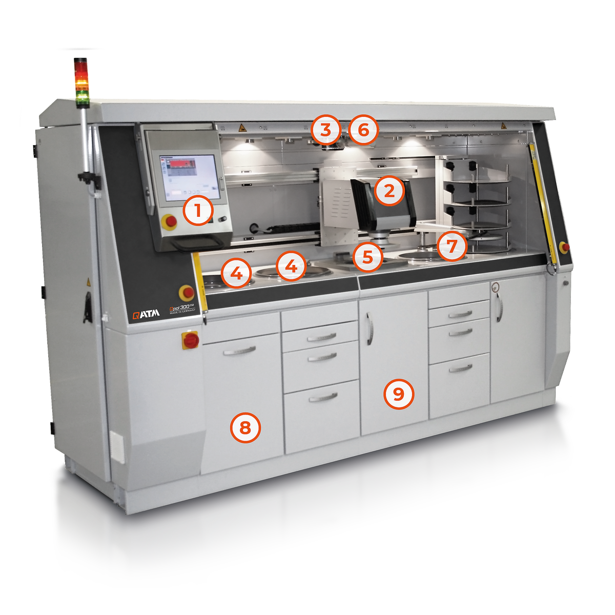 Con el Qpol 300 BOT, QATM ha desarrollado un dispositivo compacto único y totalmente automático que automatiza todo el proceso de pulido y esmerilado, incluyendo la limpieza y el secado.