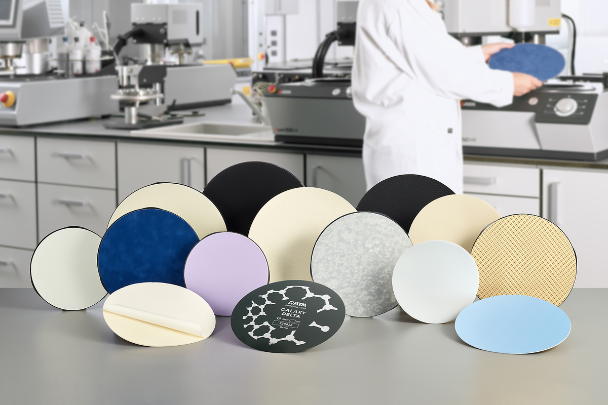 Pour un polissage sans déformation et sans relief, le choix du bon tissu de polissage est décisif. Le matériau du tissu et sa texture (soie, soie artificielle, fibres chimiques, tissu de laine, feutre, tissus synthétiques floqués ou expansés) ainsi que l'élasticité aux chocs qui en résulte jouent un rôle décisif dans le choix du tissu de polissage. Différents systèmes de fixation sont également disponibles (disque métallique GALAXY avec feuille magnétique ou chiffons de polissage autocollants avec GALAXY X-Tap). Les tissus de polissage GALAXY, optimisés avec le revêtement arrière antidérapant QPREP, résistent à des forces de cisaillement élevées, même avec des pressions de contact élevées et des porte-échantillons entièrement équipés, et garantissent toujours un processus de polissage stable.