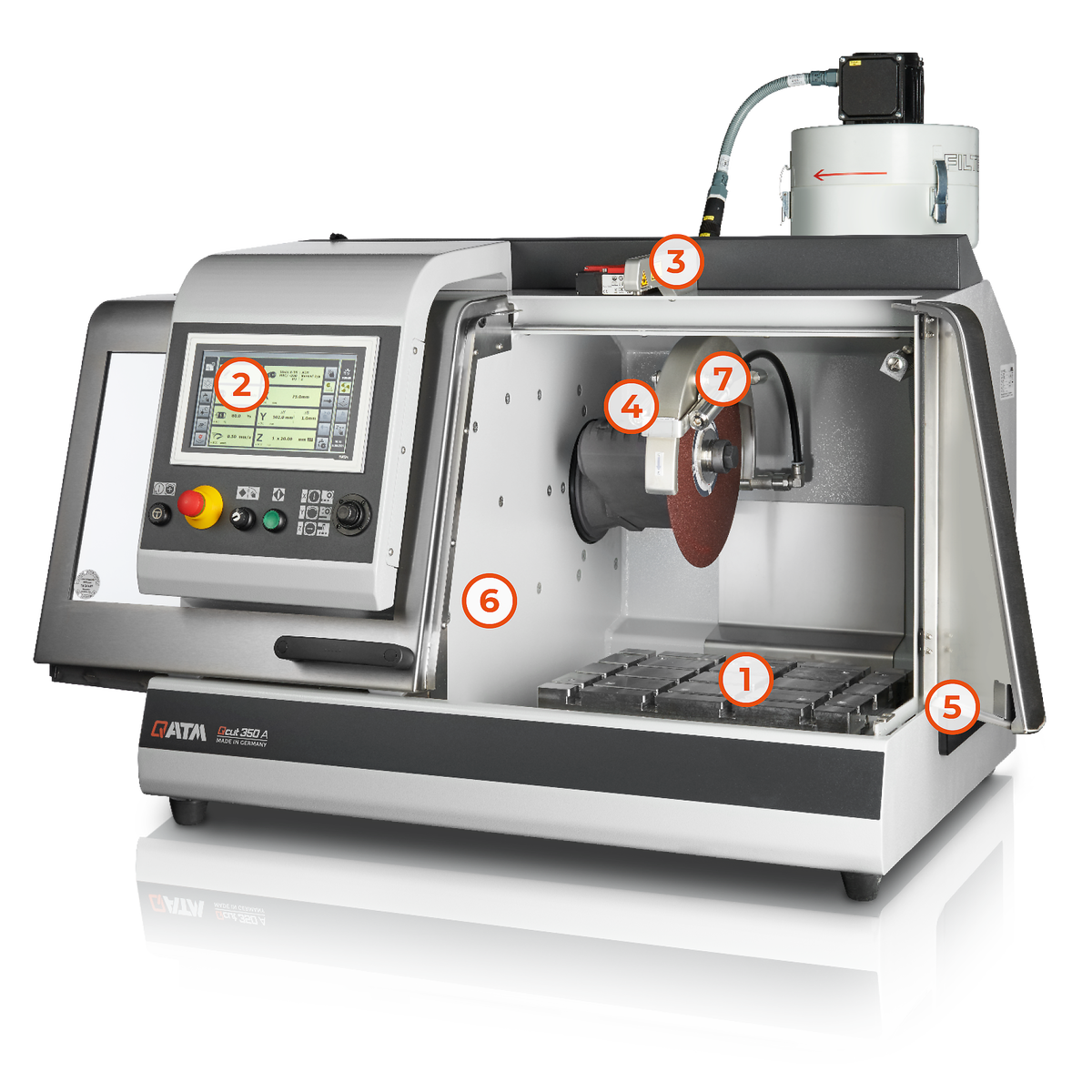 L'espace de coupe et la table de travail considérablement agrandis, associés au capot de protection du disque de coupe guidé parallèlement, permettent une course nettement plus importante pour tous les axes. La porte latérale garantit un accès optimal à l'espace de coupe et l'ouverture supplémentaire pour l'alimentation de longues pièces d'échantillons ouvre de nombreuses possibilités.
