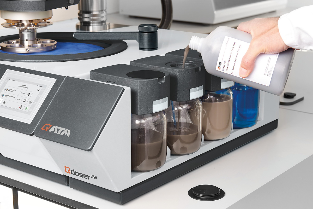I dosatori completamente automatici Qdoser ECO e Qdoser ECO+ velocizzano i processi di levigatura e lucidatura nel laboratorio di materialografia e sono progettati per l'uso con le pre-levigatrici e lucidatrici automatiche della serie Qpol 250/300 A. 4 bottiglie di vetro avvitabili da 500 ml possono contenere sospensioni diamantate, lubrificanti o sospensioni per la lucidatura finale e possono essere riempite attraverso un coperchio separato, anche durante il funzionamento. Si rimuovono rapidamente per facilitare la pulizia, mentre una funzione di risciacquo mantiene puliti i tubi.