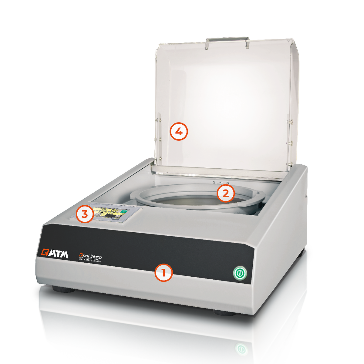 La cappa trasparente, con chiusura morbida, mostra l'eccellente qualità delle macchine e dei dispositivi QATM. Protegge la sospensione e i campioni dalla contaminazione per ottenere i migliori risultati di preparazione. La lucidatrice Qpol Vibro offre una grande quantità di funzioni, ma è comunque compatta e leggera: con un peso di soli 45 kg è molto adatta come dispositivo da banco.