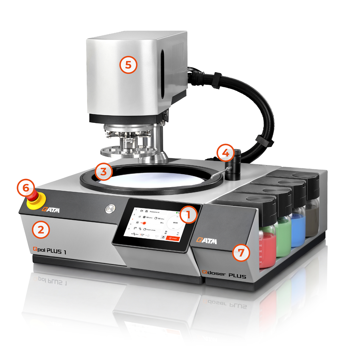 The fully automatic, software-controlled Qdoser dosing system speeds up the grinding and polishing processes in the materialography laboratory and is compatible with devices in the Qpol M, GO, and PLUS series. Four screw-top 500-ml glass bottles can be filled with QPREP diamond suspensions, QPREP lubricants (diamond lubricants), and/or QPREP fine-polishing suspensions through a separate opening in the lid. The suspension storage bottles are easy to remove, making them simple to clean. A backflush function keeps the connecting hoses clean.