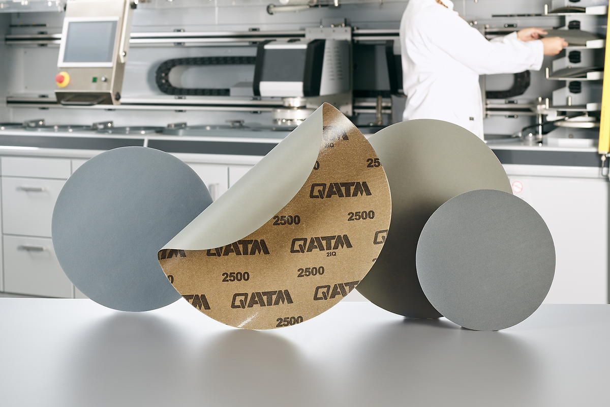 Silicon carbide grinding paper with foil backing can be used individually and are ideally suited for a wide range of varied materials. They offer a high degree of flexibility, especially for frequently changing material variants. Furthermore, the foiled paper enables the use of the "Vakujet" vacuum fixation in the QATM automatic grinding and polishing machine Qpol 300 Bot. QPREP silicon carbide grinding paper with foil backing is available in diameters of 250 mm and 300 mm and in 12 different grain sizes. For a diameter of 350 mm we recommend the GALAXY X-Tap with self-adhesive grinding paper.