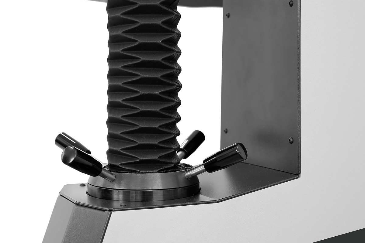 Via stable, ultra-precise roller-bearing spindle guide. Solid, nomaintenance structure. Each Rockwell hardness tester is available with a Ø25 mm table mount (optional ¾” adapter available) facilitating the use of a wide range of test tables and devices.
