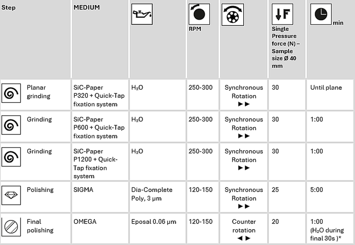 Proper grinding and polishing are essential for revealing the microstructure of cast iron without introducing deformation or damaging the graphite structure. The goal is to produce a flat, scratch-free surface that preserves both the graphite morphology and the matrix, enabling accurate metallographic evaluation. A recommended preparation method for CJS and CJL type cast iron is shown in the table.